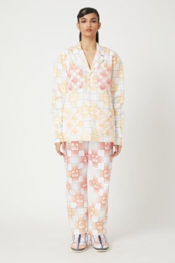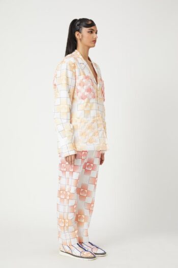 A semi fitted blazer with pleats. The pleats on the blazer have been printed on one side to create an illusion. There are 2 pockets in the front and 2 pockets at the back of the blazer. Blazer has a front opening.