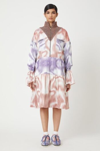 A long jacket is paired up with matching printed pants. Pants has a front button and zipper opening. Pants also have pockets on either side seams