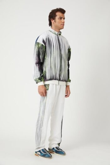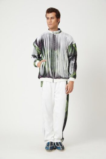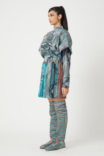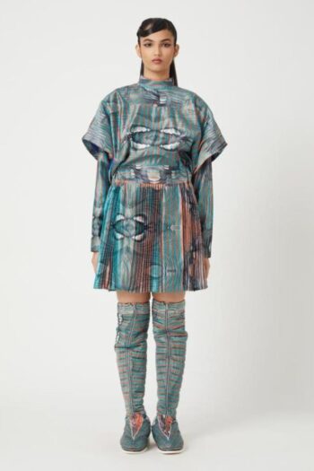 An anti fit sweatshirt with modular panels. Sweatshirt top panel is pleated with a single side print on it. The printed pleat helps in creating the illusion of colours, thus different colours appear from different angles. The pleated panel can be removed to reveal a different and less warmer garment. Under layer has pockets in the front to add functionality to it. Sweatshirt has a turtleneck collar with a centre back and shoulder zipper opening. Sleeves are shorter than full sleeves with gathers at its cuff to add volume to it. sweatshirt has been paired up with pleated colour block shorts.