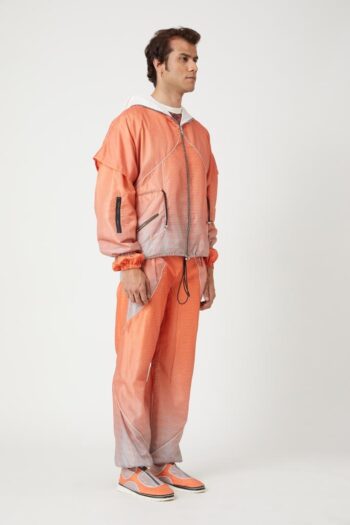 A box fit CARTEX-pleated bomber jacket has been paired up with printed pants with centre front zipper opening and one pocket on each side seams.